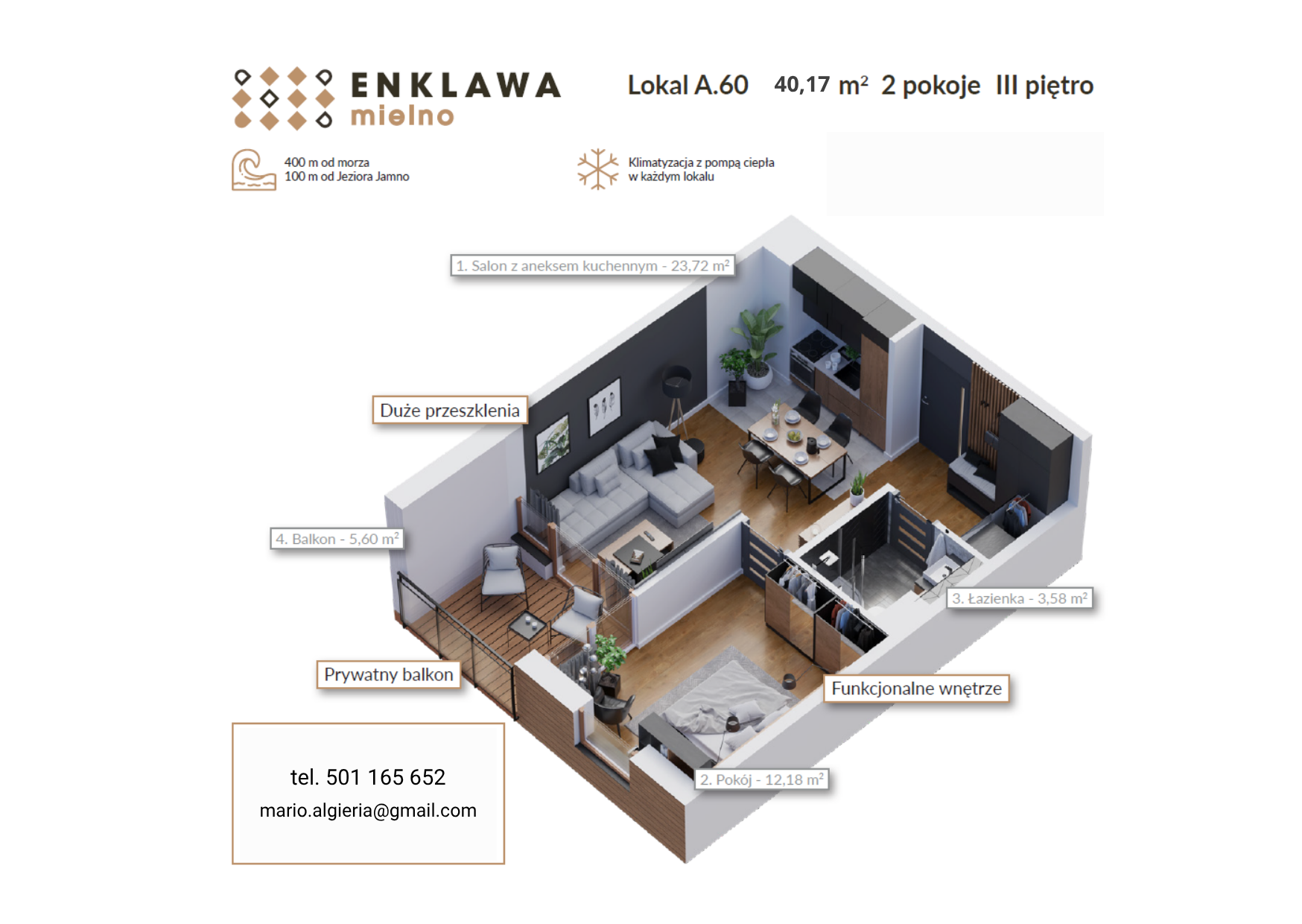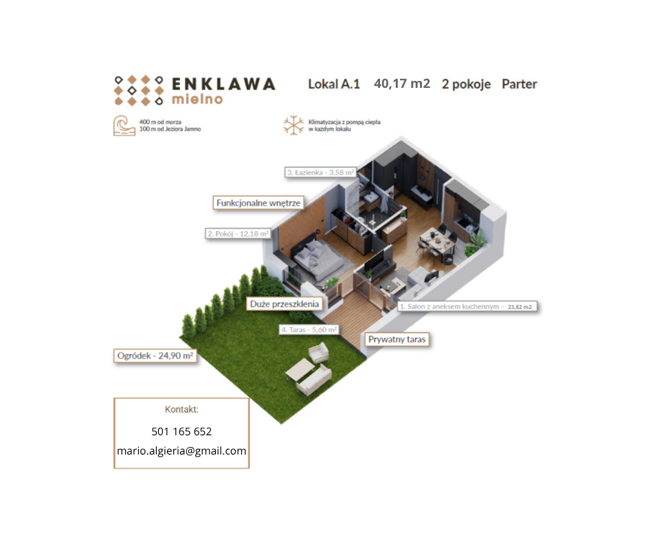 Lokal A.60, położony na trzecim piętrze (z windą) z południowej strony budynku, oferuje widok na Jezioro Jamno, który można podziwiać prosto z balkonu – wyjątkowa perspektywa, która każdego dnia pozwala poczuć wakacyjny klimat.